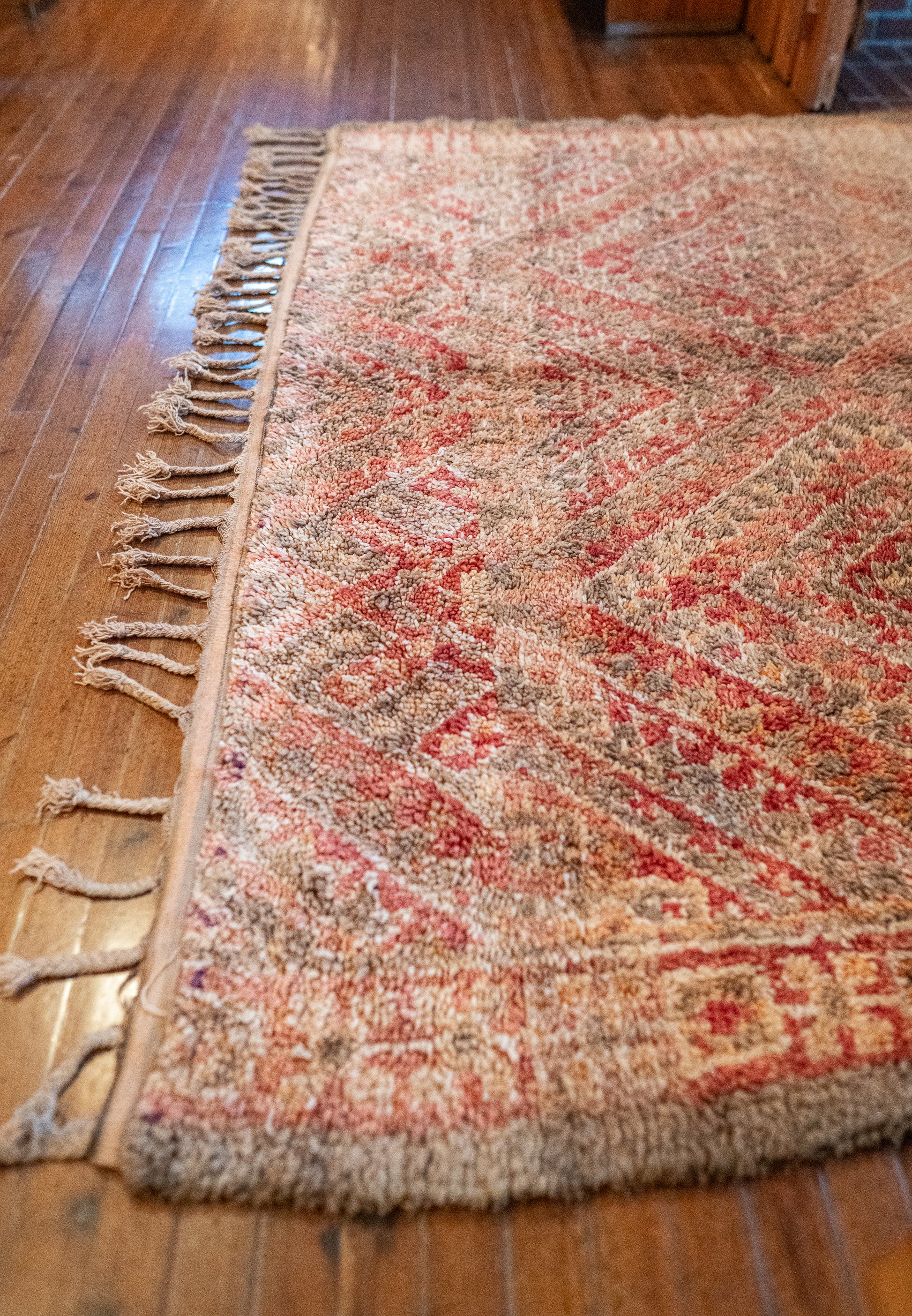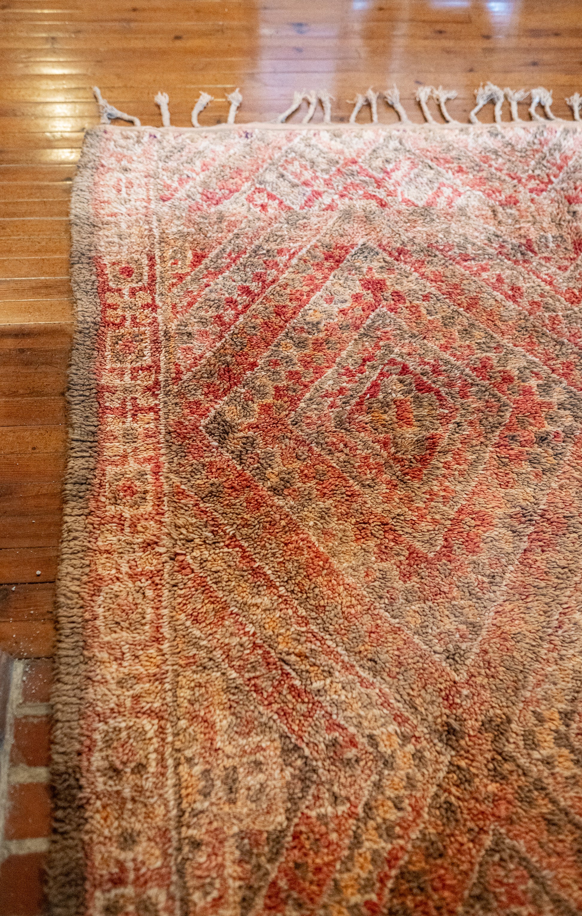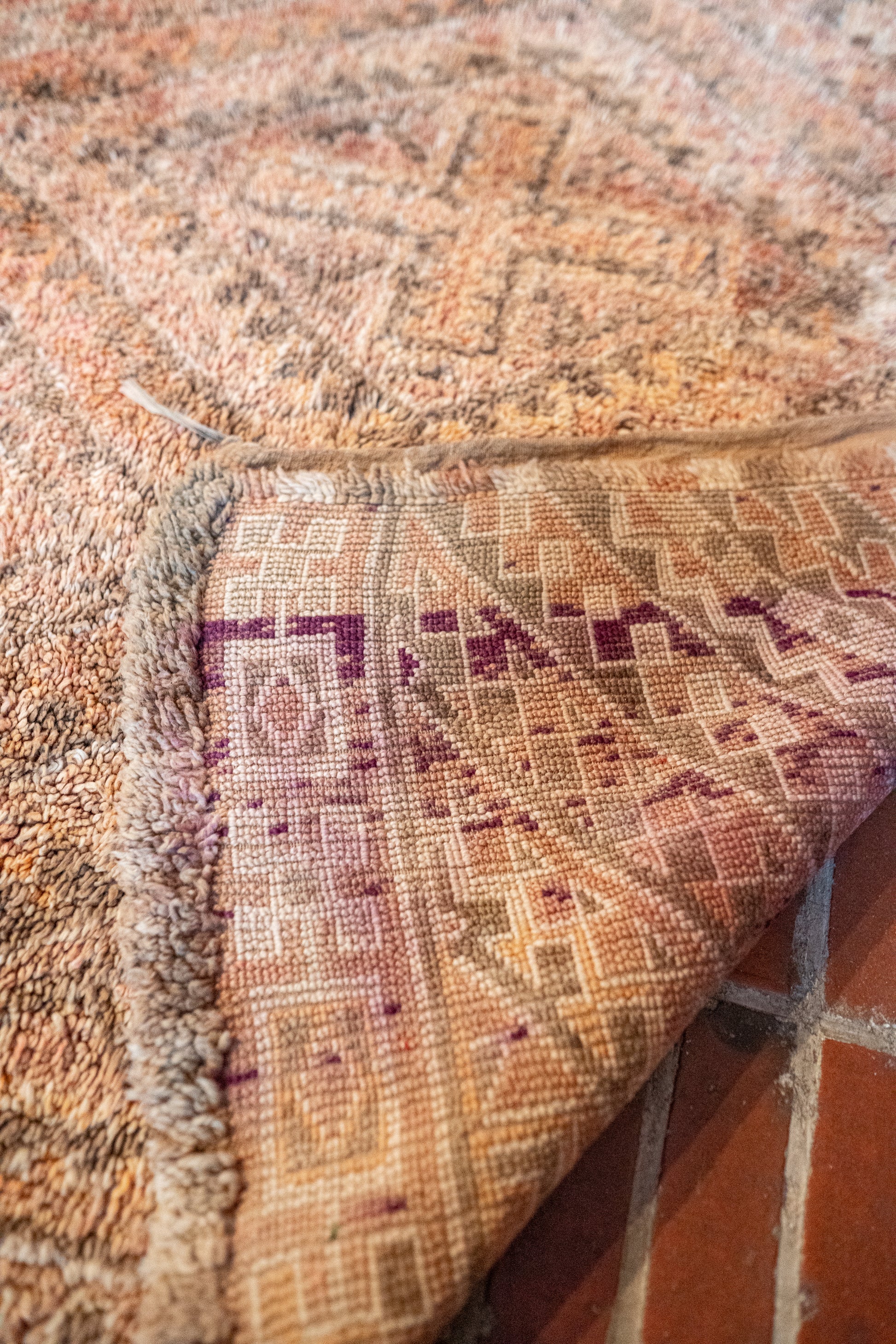 Kaunis Beni M’Guild -vintagematto, joka hehkuu pehmeissä ja maanläheisissä sävyissä. Pehmeät persikan ja poltetun oranssin sävyt luovat lämpimän ja rauhoittavan tunnelman, joka tekee tilasta kutsuvan ja levollisen.