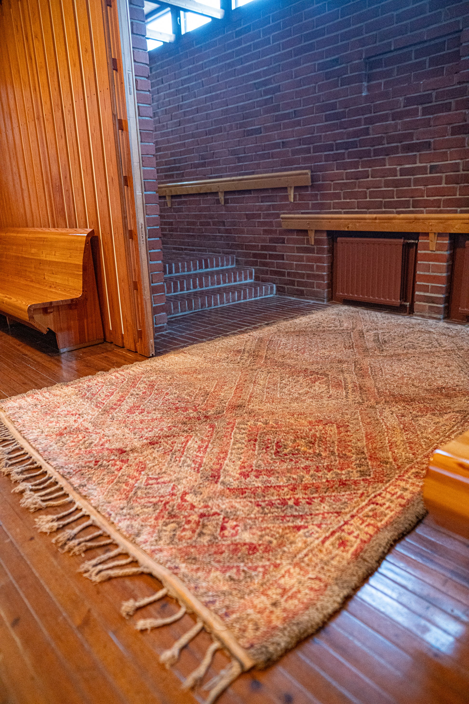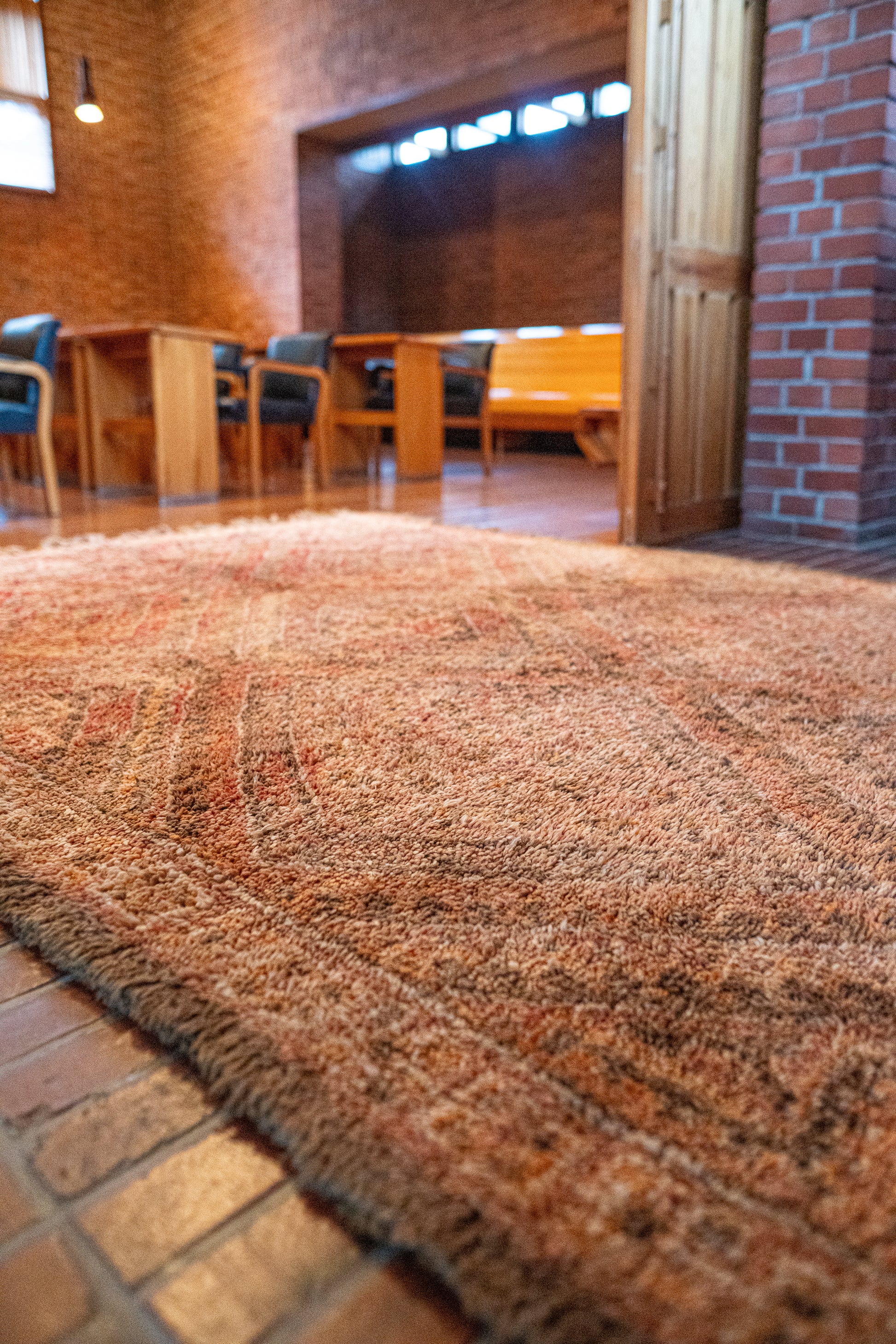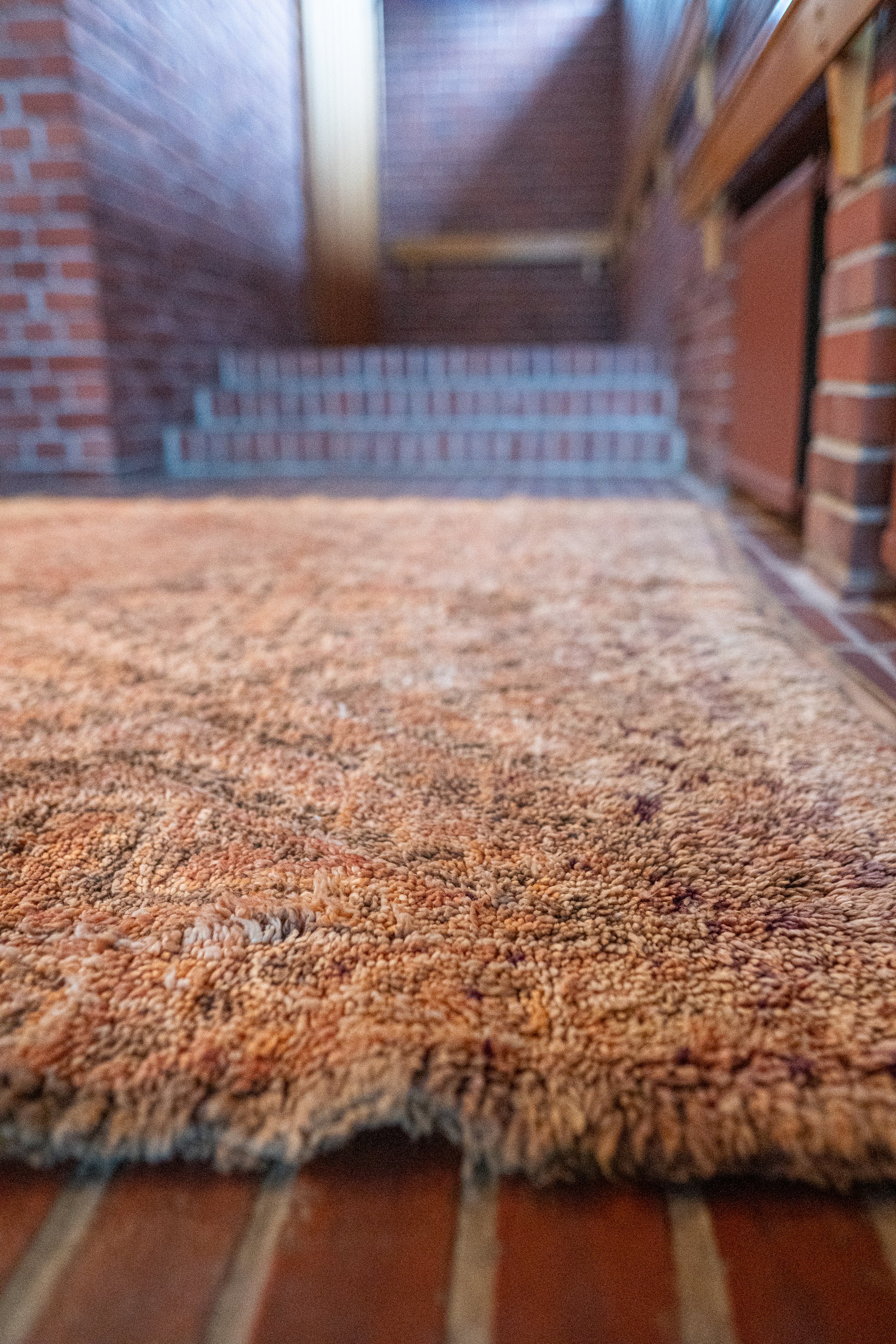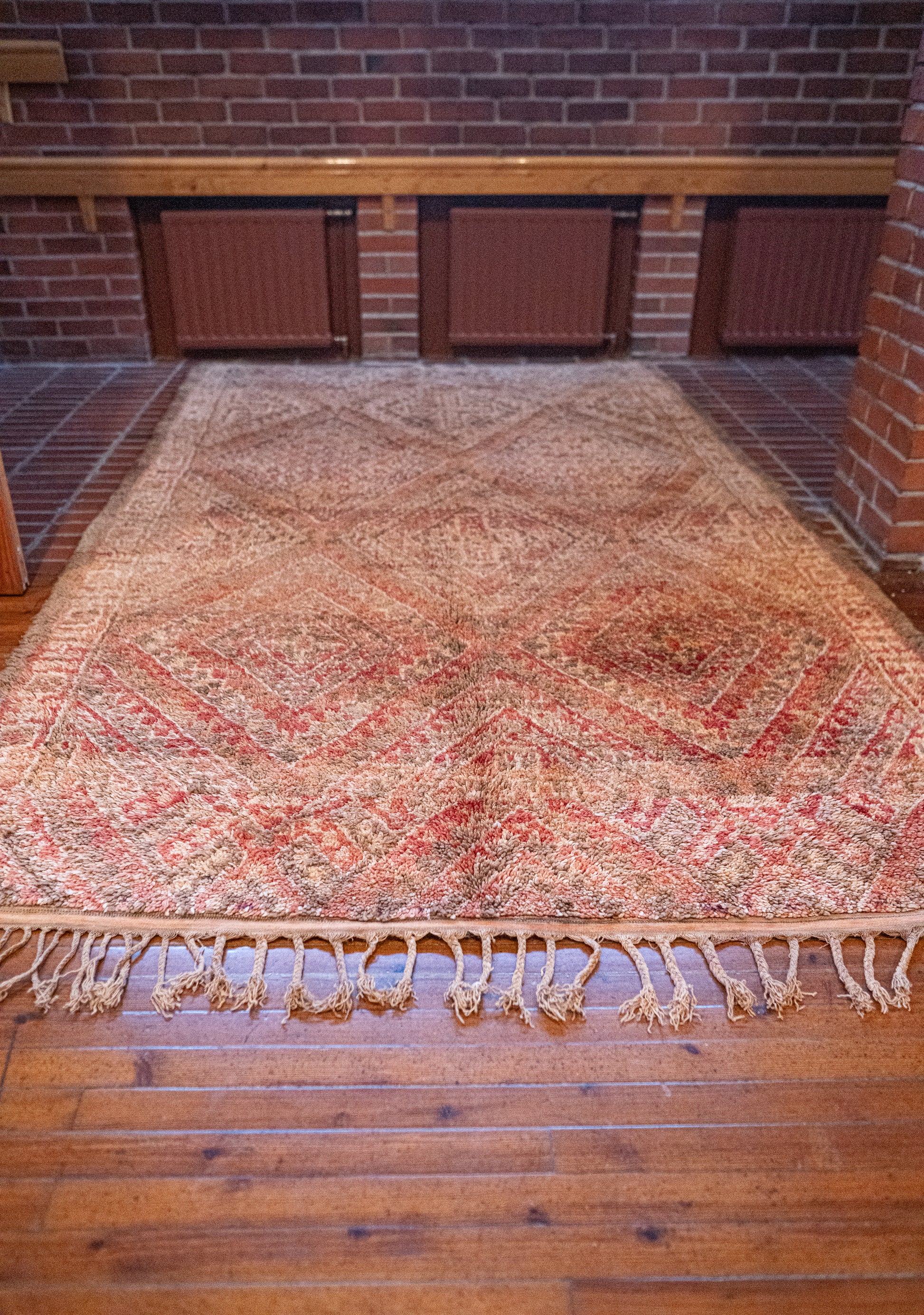 Kaunis Beni M’Guild -vintagematto, joka hehkuu pehmeissä ja maanläheisissä sävyissä. Pehmeät persikan ja poltetun oranssin sävyt luovat lämpimän ja rauhoittavan tunnelman, joka tekee tilasta kutsuvan ja levollisen.