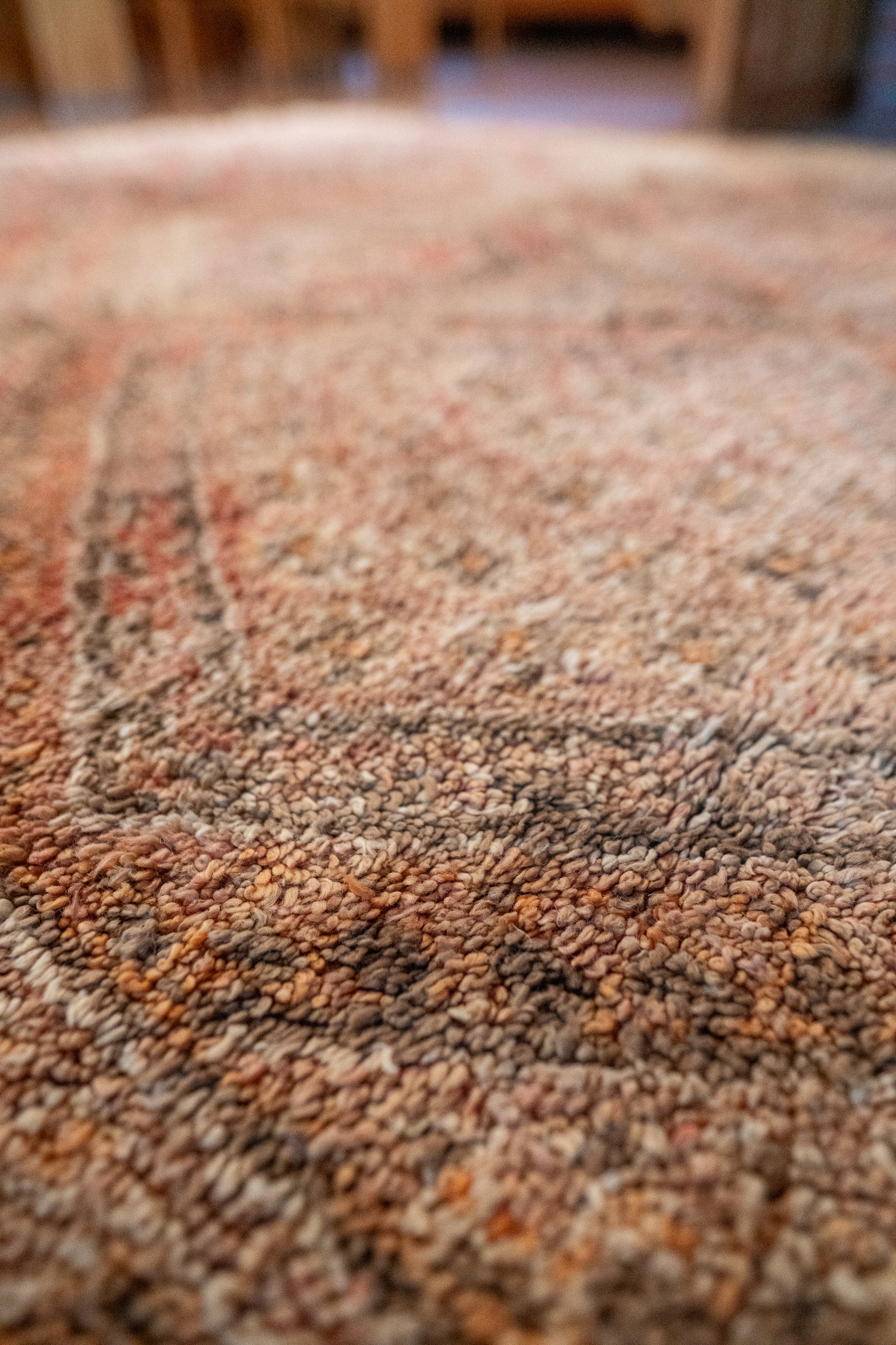 Matto on toteutettu huolella ja laadukkaasti. Sen tuntu on raskas ja ylellinen, ja villa silkkisen pehmeää. Vivahteikas persikkainen pohjasävy elää kauniisti yhdessä luonnonvalkoisen ja neutraalin ruskeanharmaan, kanssa. Hailakan oranssit yksityiskohdat tuovat kokonaisuuteen hienovaraista elävyyttä.