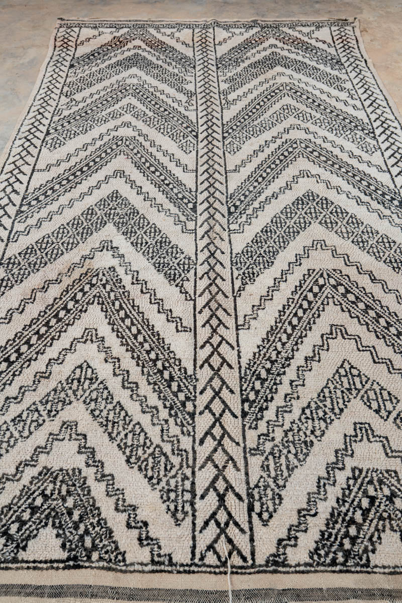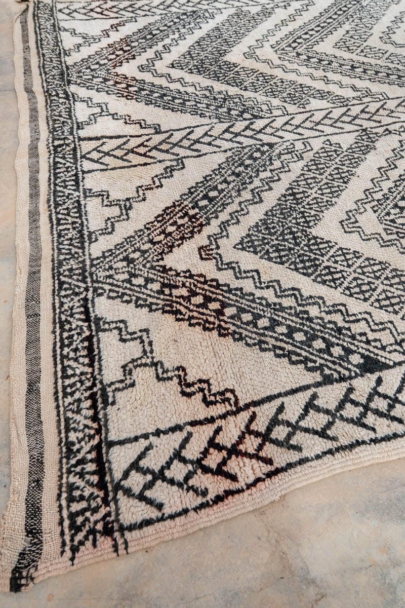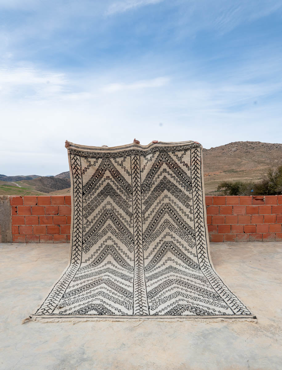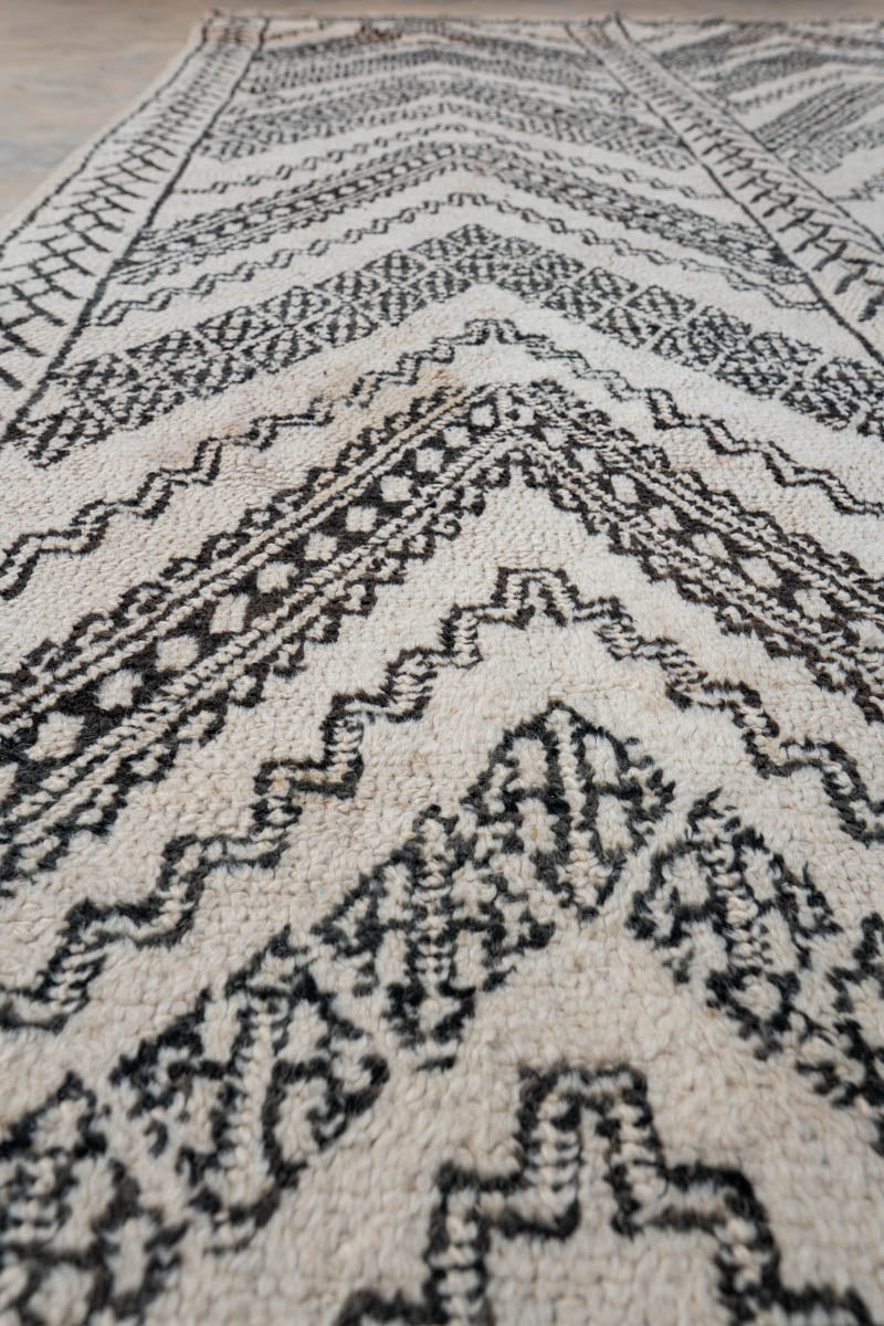 “ZicZac” on näyttävä ja autenttinen Beni Ouarain -vintagematto, jossa mustavalkoinen värimaailma ja voimakas geometrinen design kohtaavat. Maton monimuotoinen siksak-kuvio tekee siitä erityisen kiinnostavan – harvinaisemman tulkinnan perinteisestä Beni Ouarain -kuviomaailmasta.