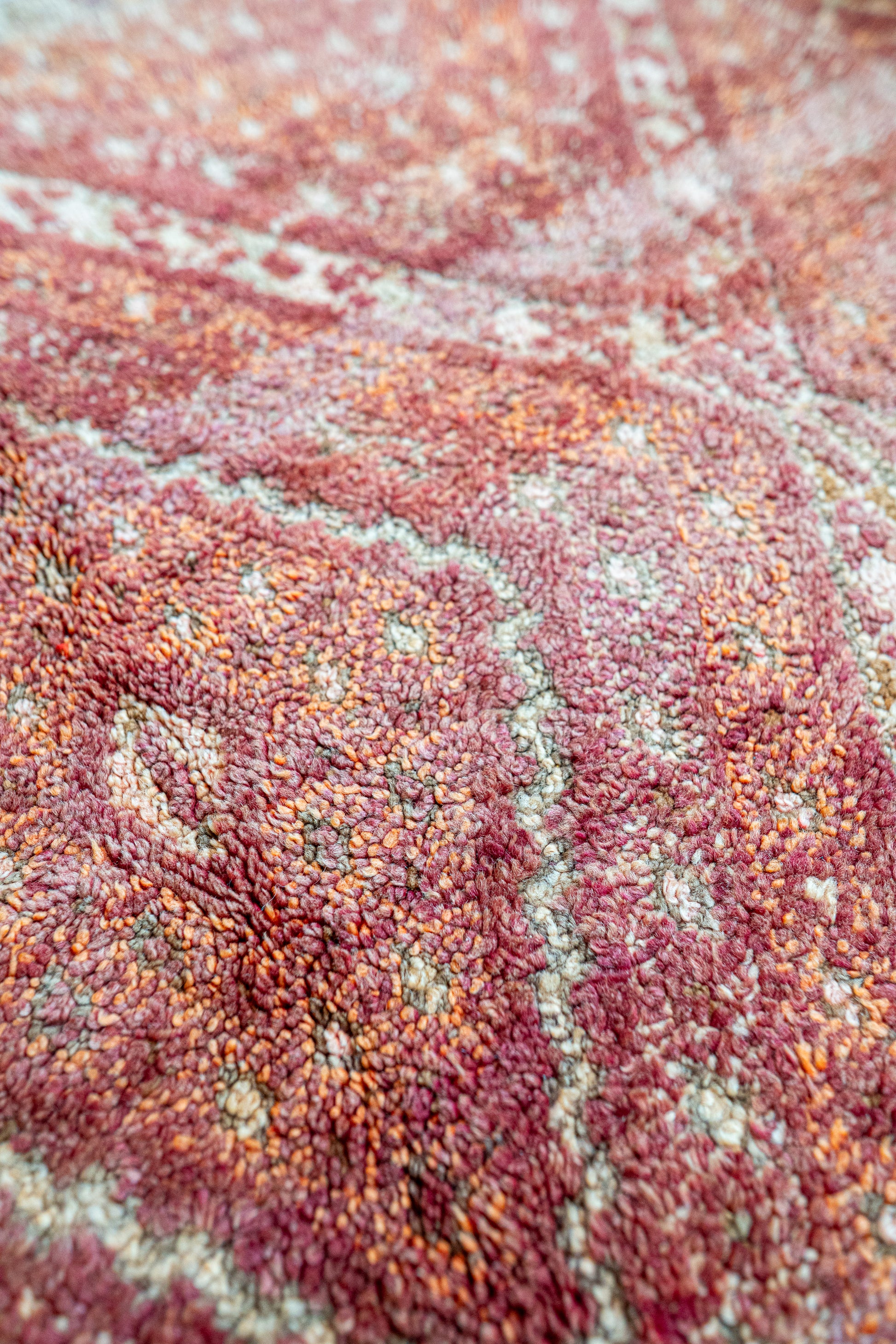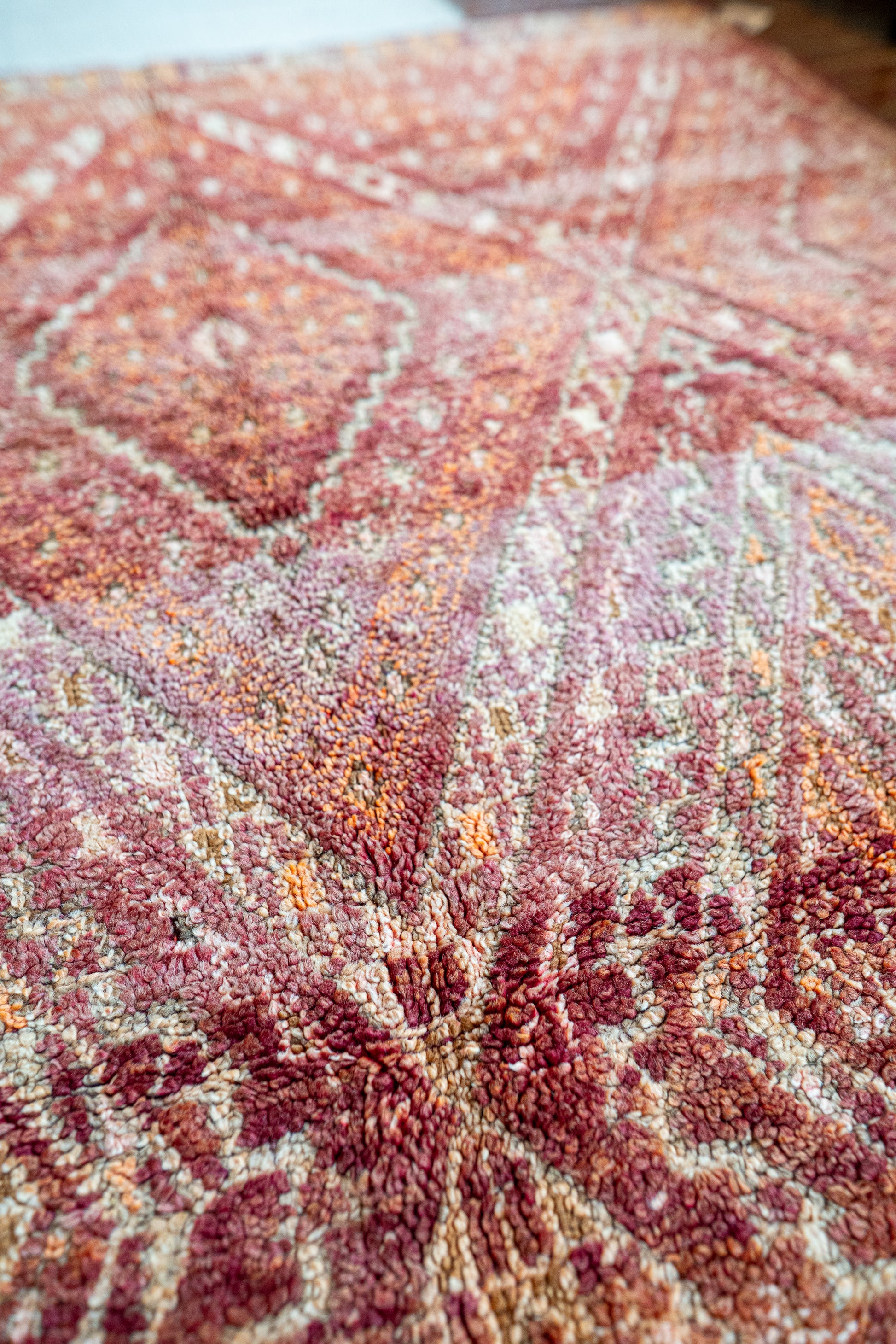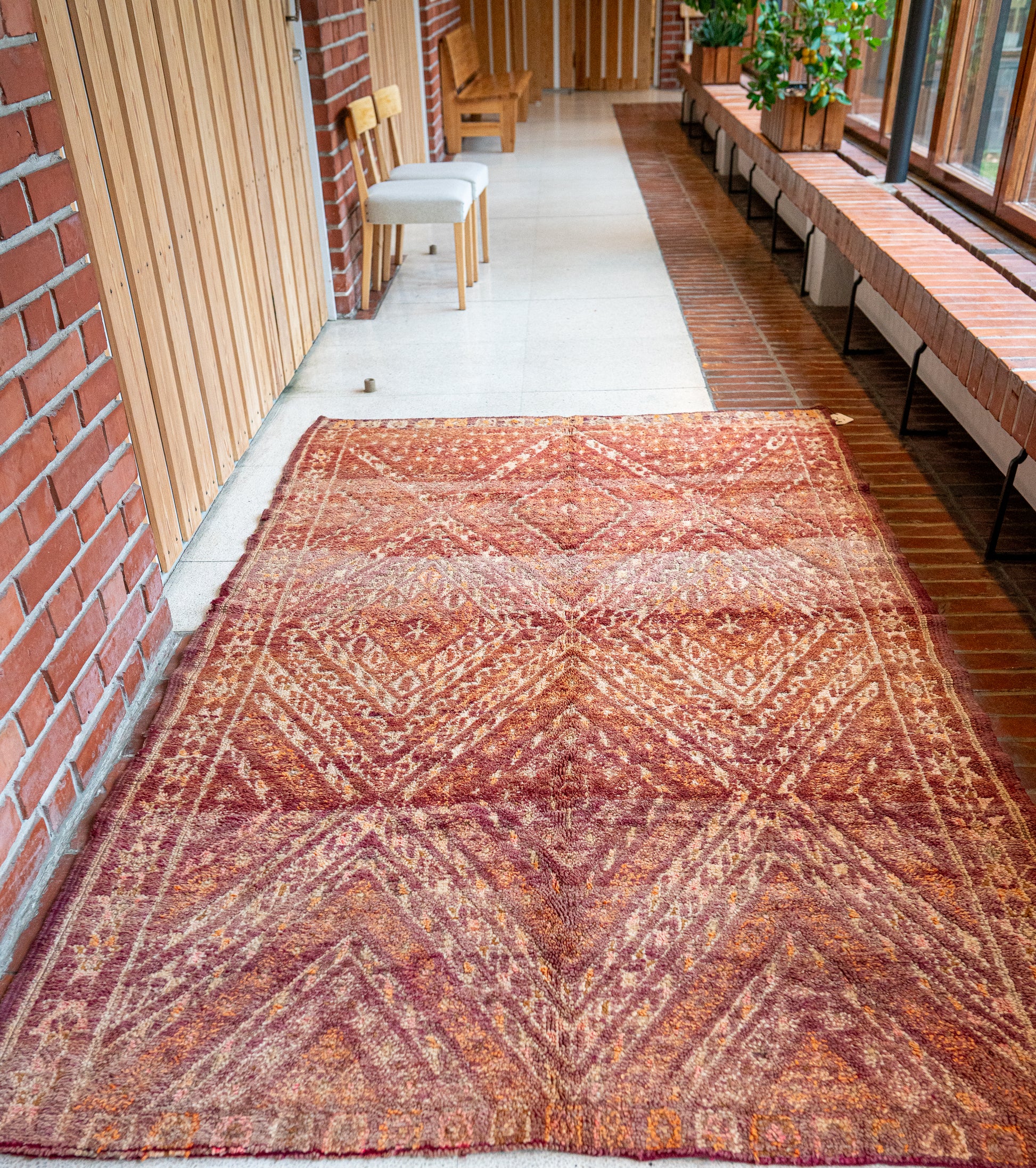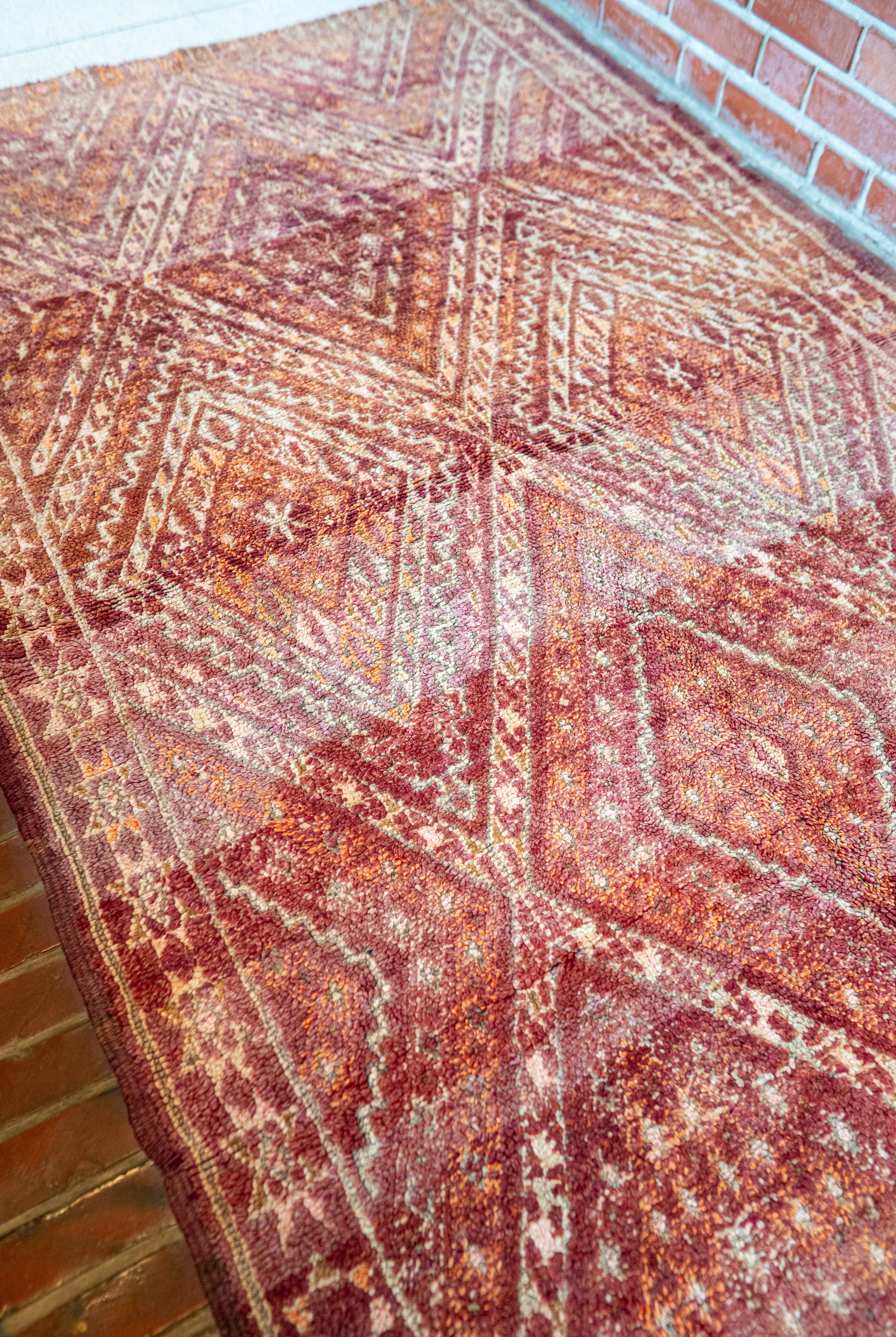 A deep and nuanced colour palette makes this Moroccan Zayan vintage rug particularly striking. The rust and açaí-red base tone shifts beautifully with light and space, while hints of orange add warmth to the overall look. The pattern is refreshed by delicate touches of soft pink, natural white and greenish grey.